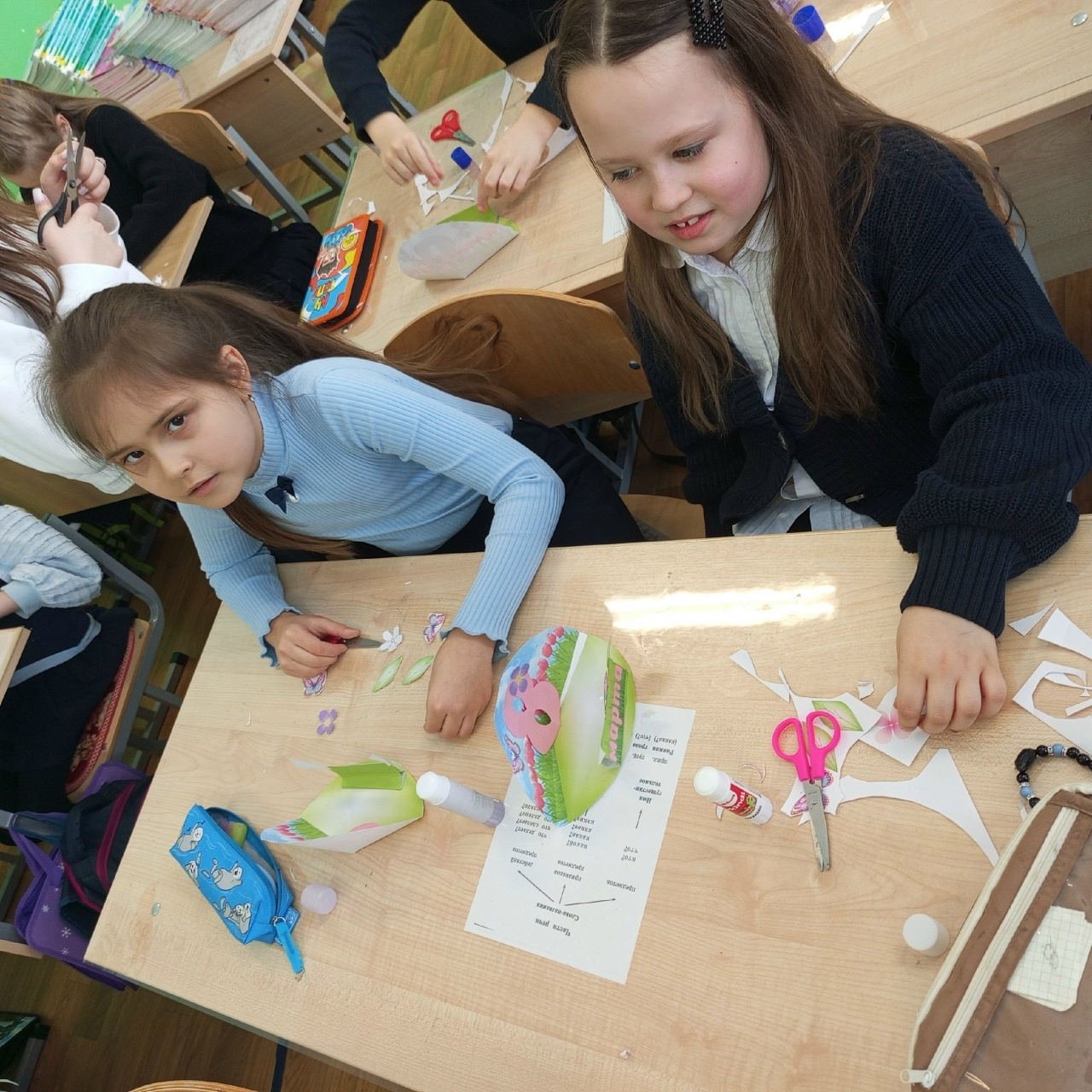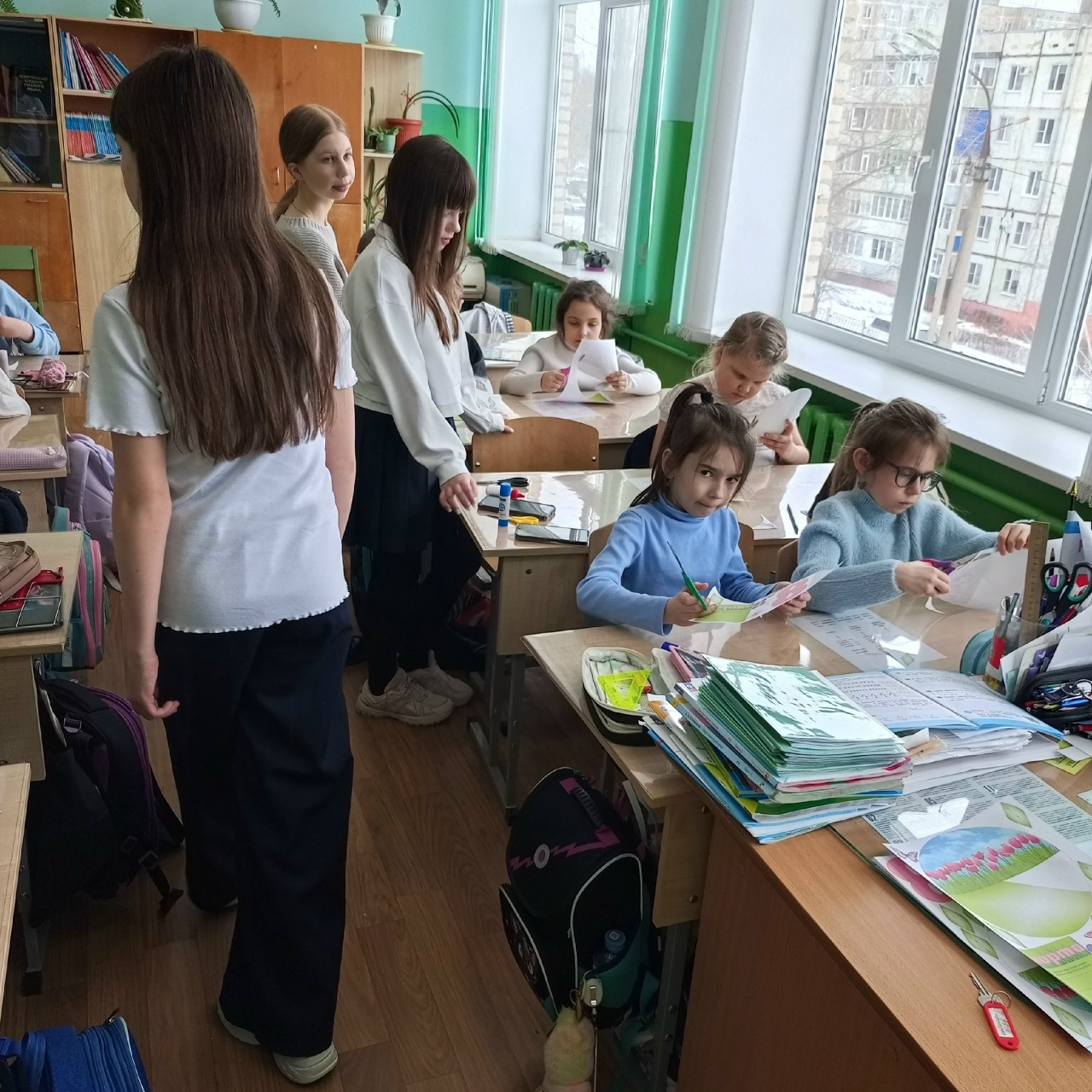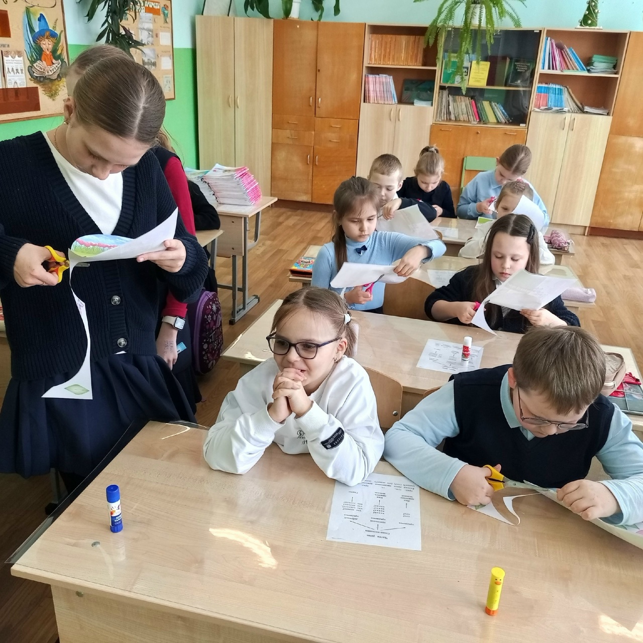 Активисты 6 "Б" провели творческий урок для 2 "Б" класса! Вместо скучных занятий — море цветной бумаги, клея и фантазии.