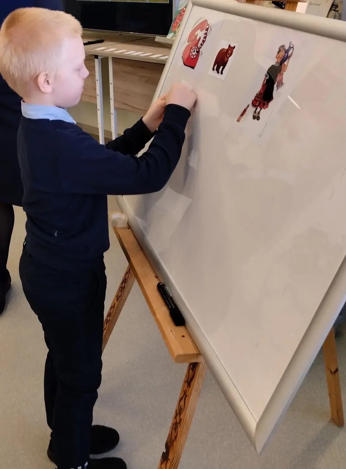 Интерактив с картинками: На мольберте «встретились» две сказки: «Федорино горе» и «Телефон». Задача у школьников была серьёзная: разобрать картинки и распределить их по произведениям. Дети не только правильно приклеили все картинки, но и порадовали цитатами из любимых стихов. Получилось громко, весело и познавательно!