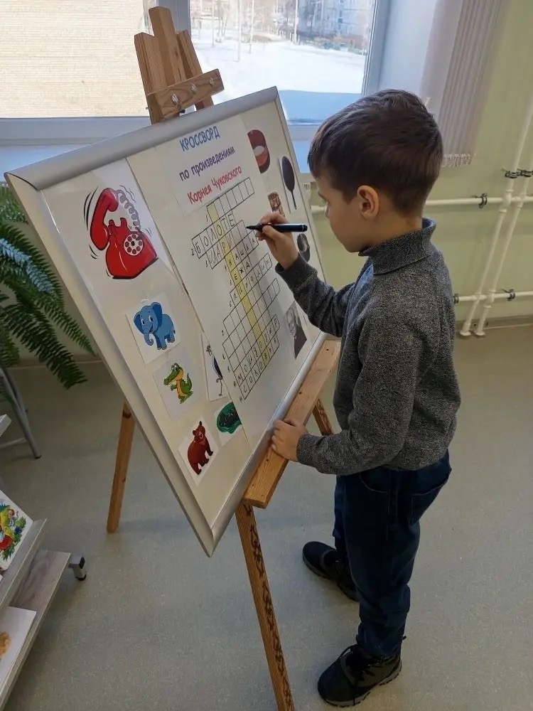 Игры и головоломки: Юные читатели с азартом отгадывали тематический кроссворд и собирали пазлы по произведениям Чуковского, а потом угадывали, какая сказка получилась.