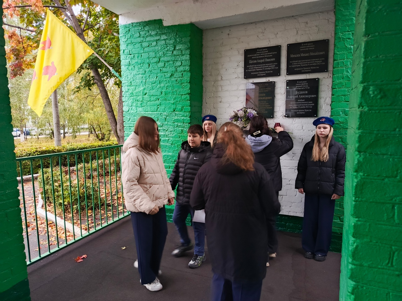 Обучающиеся возложили цветы к мемориальным доскам, погибшим в ходе СВО выпускникам школы. На время проведения митинга рядом с мемориальными досками был организован почетный караул членами юнармейского отряда "Патриот", руководитель Сергеев А. В.
