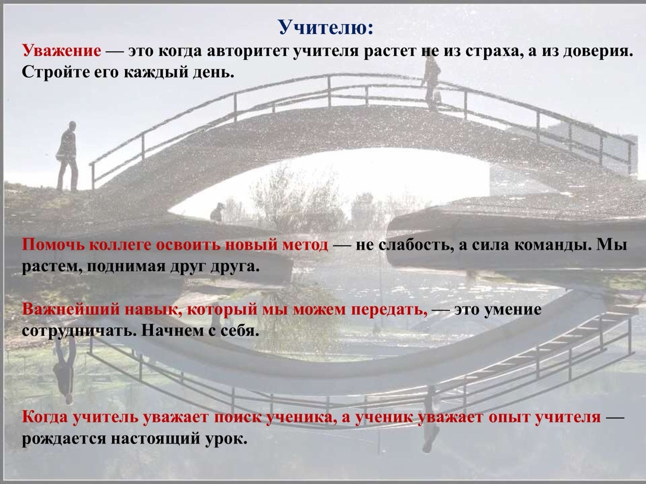 Учителей — к профессиональному диалогу, взаимопомощи и обмену мастерством.
