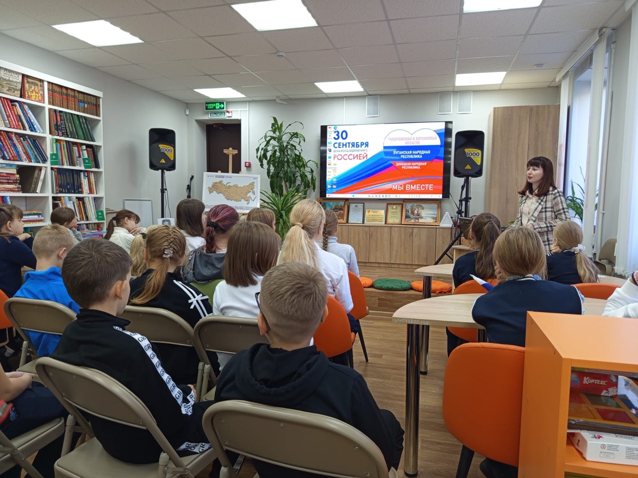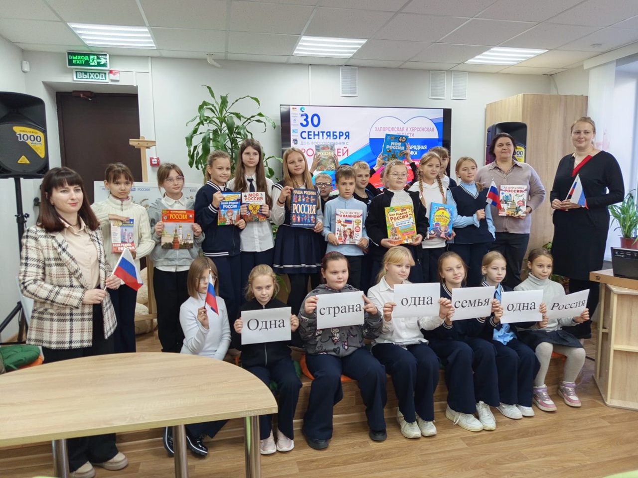 30 сентября, для учащихся 4-Г класса (кл. руководитель Матвеева Н. В.) в детской модельной библиотеке прошел информационный урок «Одна семья. Одна страна» , приуроченный значимому историческому событию – воссоединению с новыми регионами России. Сотрудники библиотеки рассказали ребятам о значении праздника в историческом контексте нашей страны.