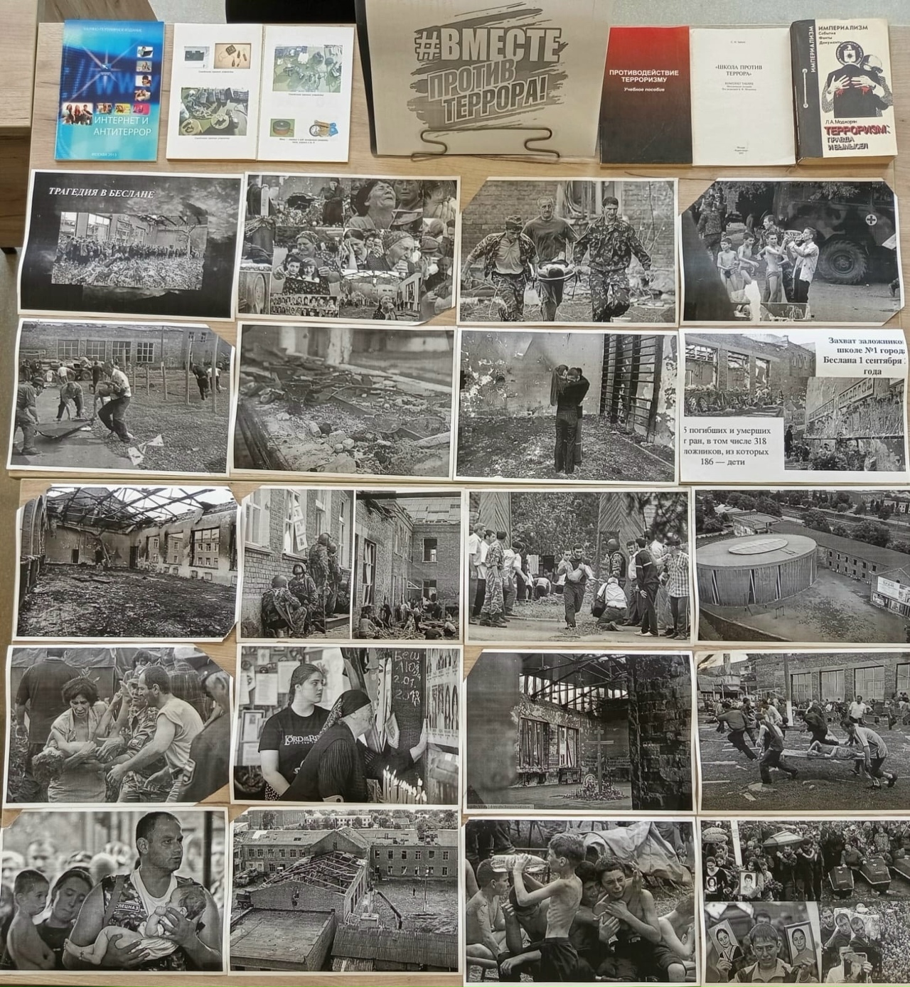 "Вместе против террора" - под таким девизом в школьной библиотеке прошёл исторический час, посвящённый памяти жертв Беслана. Для понимания сути борьбы с терроризмом необходимо знать основные понятия, которые изложены в законе "О борьбе с терроризмом". С основными пунктами данного закона познакомила обучающихся учитель истории Е.В. Донских. Информационные и фотодокументы трагедии в Беслане представлены на книжной выставке "Терроризму - нет".