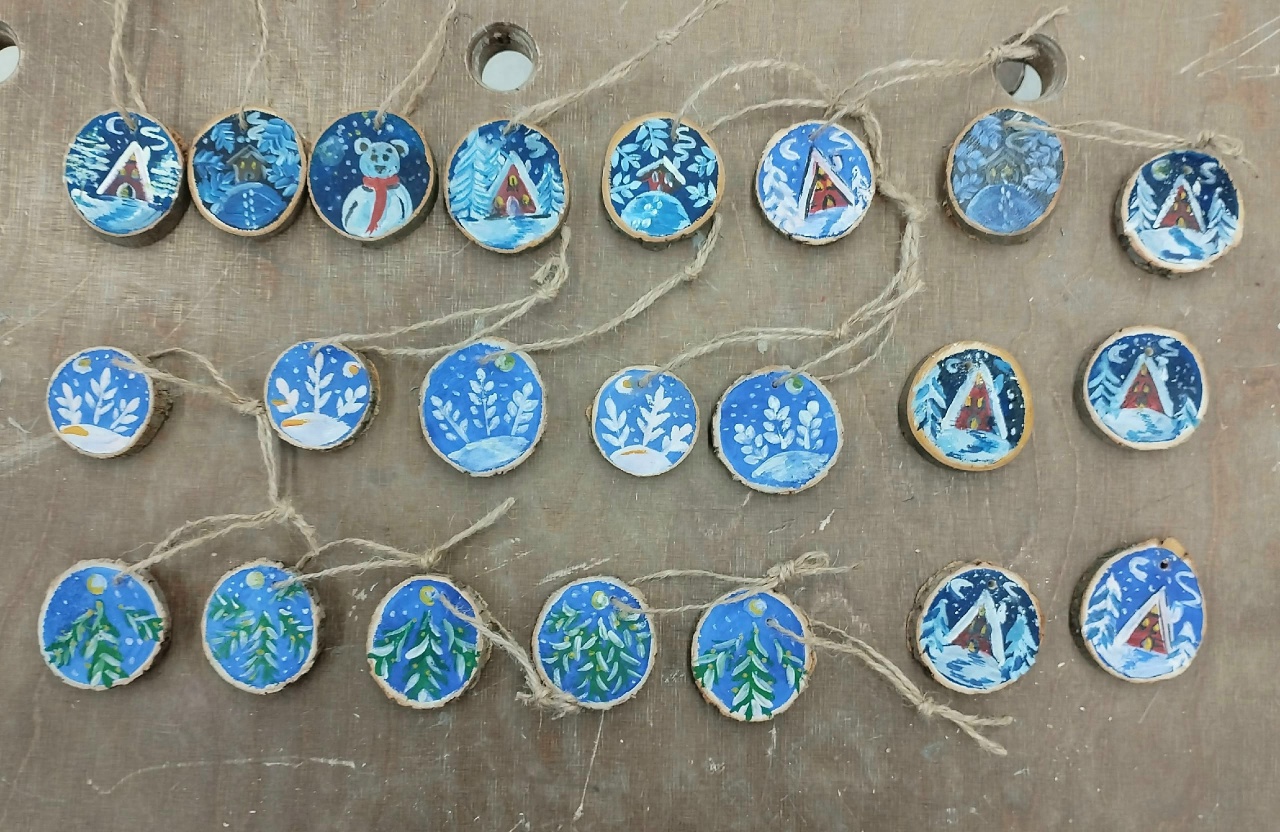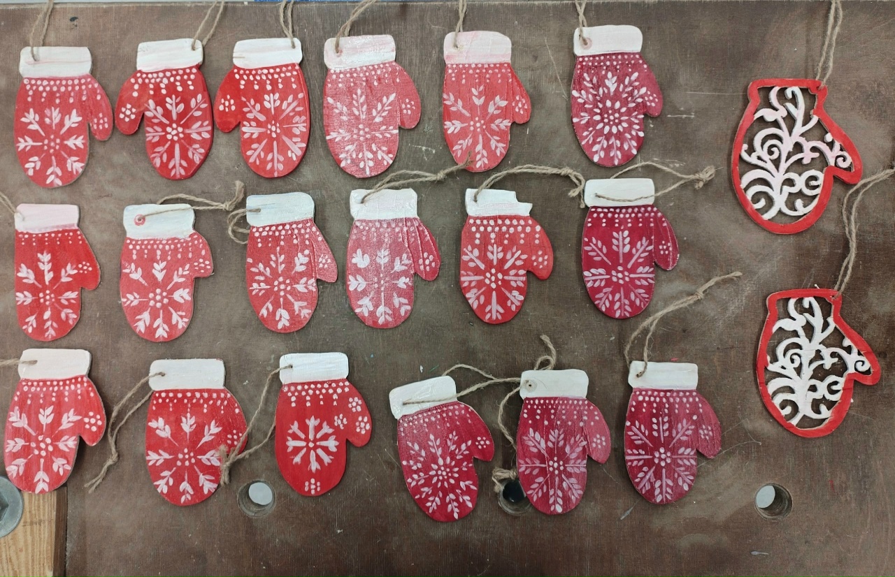 Создали своими руками новогодние талисманы — деревянные рукавички и брелоки с зимними сюжетами. Каждый — уникальный, сделанный с мыслями о защитниках.