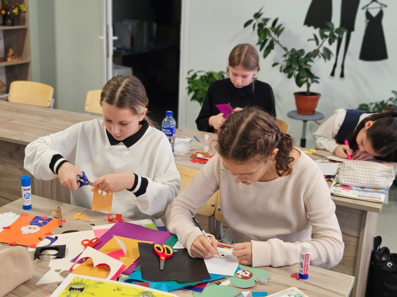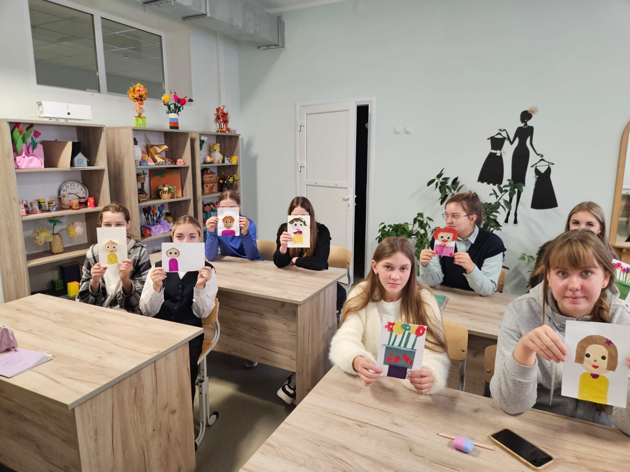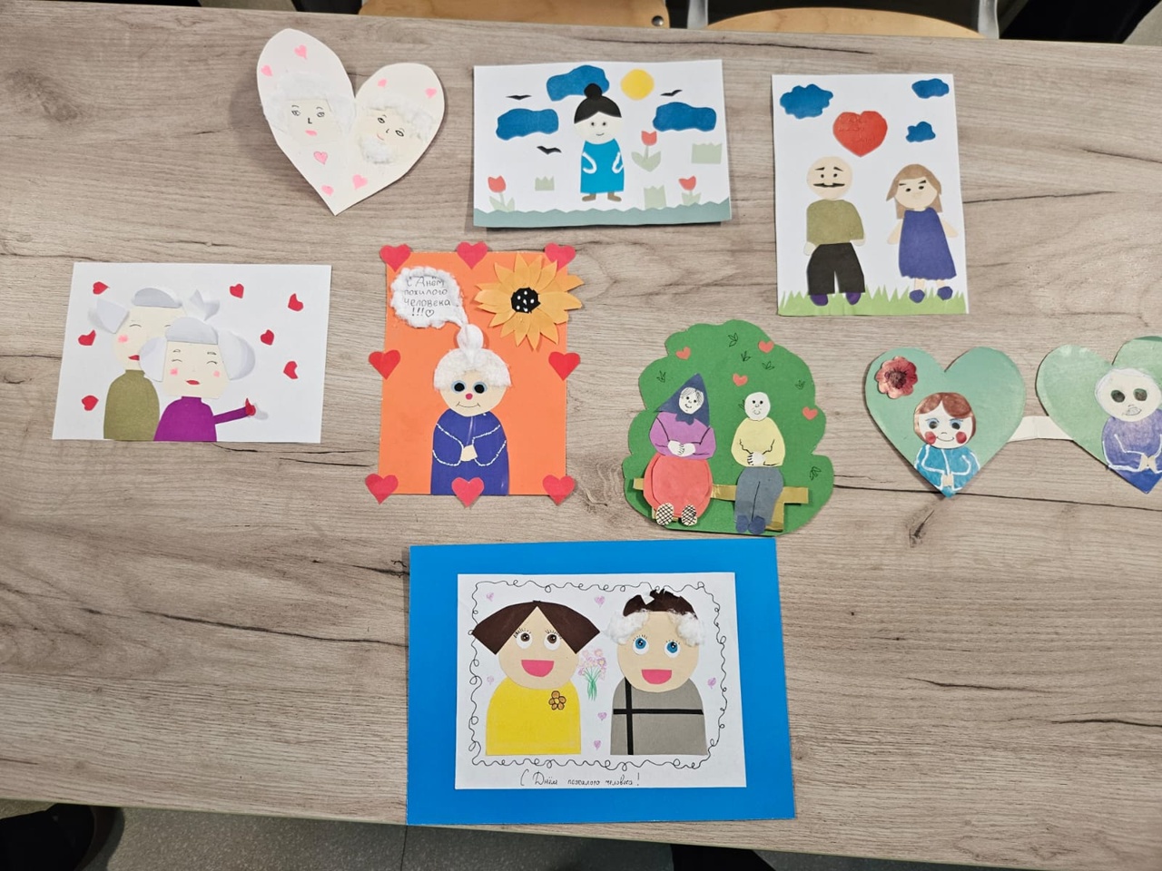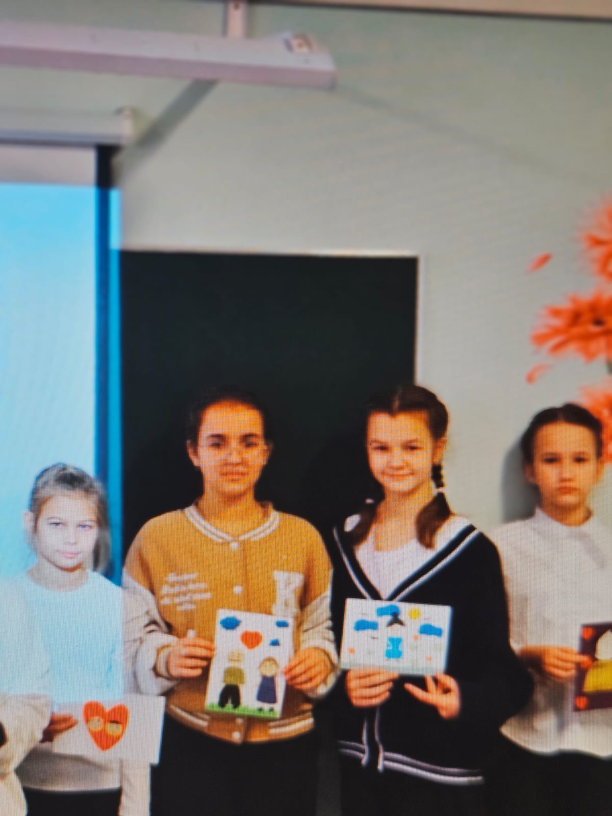 В 5 «А», 7 «А» и 7 «В» классах под руководством Калининой Е.Н, школьники изготовили открытки, проявив свою фантазию и творчество. Они старательно вырезали, приклеивали и раскрашивали портреты любимых родственников, украшая свои открытки сердечками и цветами.