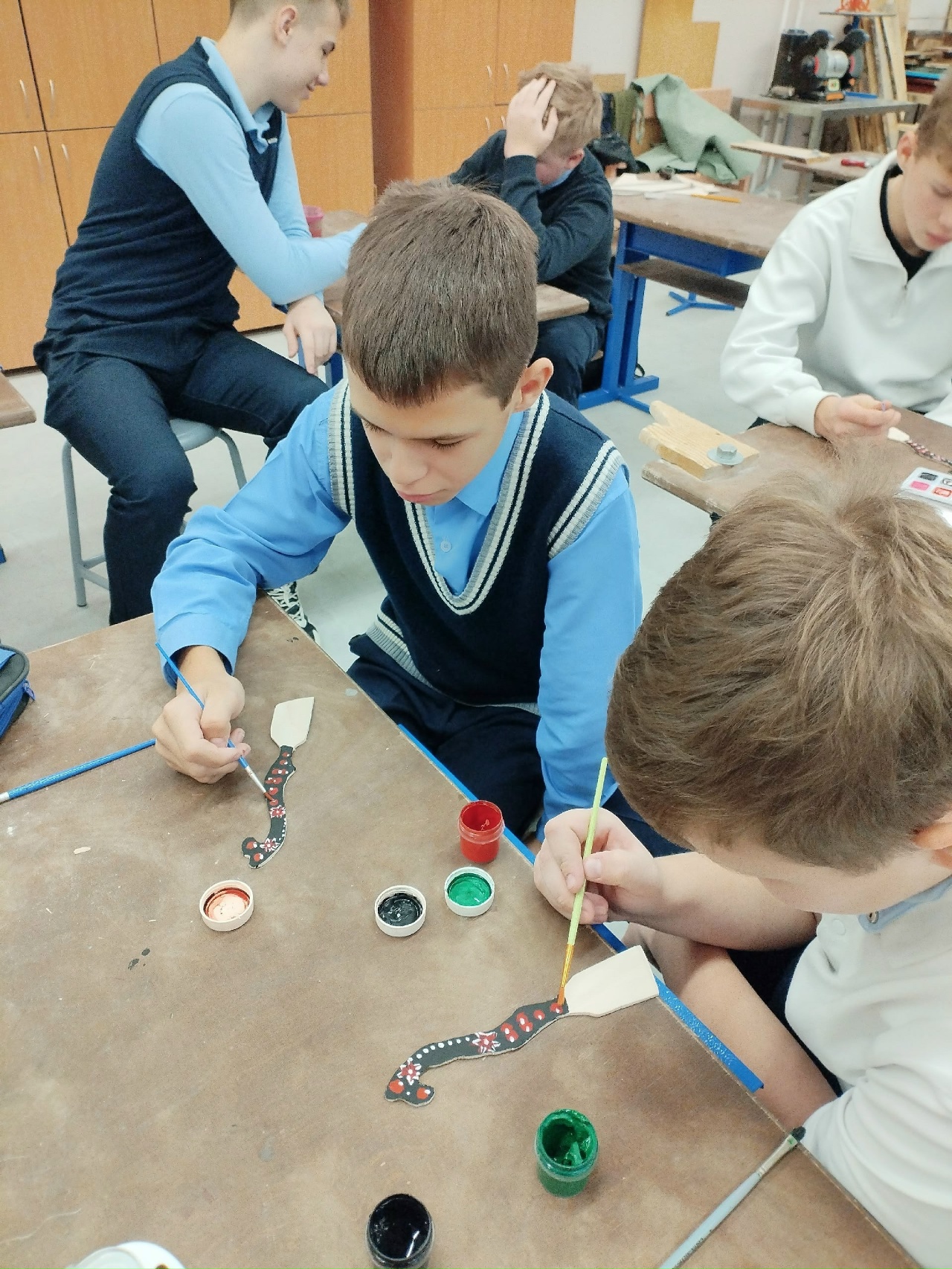 Для учащихся 7 «Б» прошел мастер-класс по росписи кухонных лопаточек для кухни. Мальчишки сами старательно выпилили лопаточки, а затем вместе с девочками расписали их красками. Под руководством учителя технологии Алдобаевой Н.И. участники мастер класса вспомнили виды и приемы русской художественной росписи и применили их на практике.