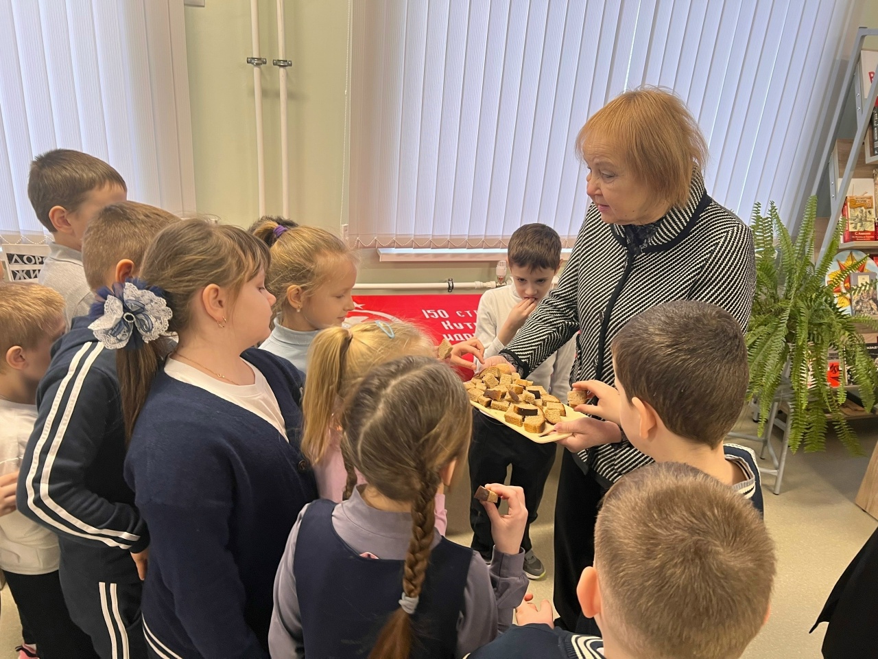Наши педагоги-библиотекари Потапенко Т.В. и Буланникова Е.А. подготовили рассказ о невероятных испытаниях, выпавших на долю ленинградцев. Они прошли по классам, держа в руках нарезанный ржаной хлеб — кусочки весом в те самые 125 граммов.