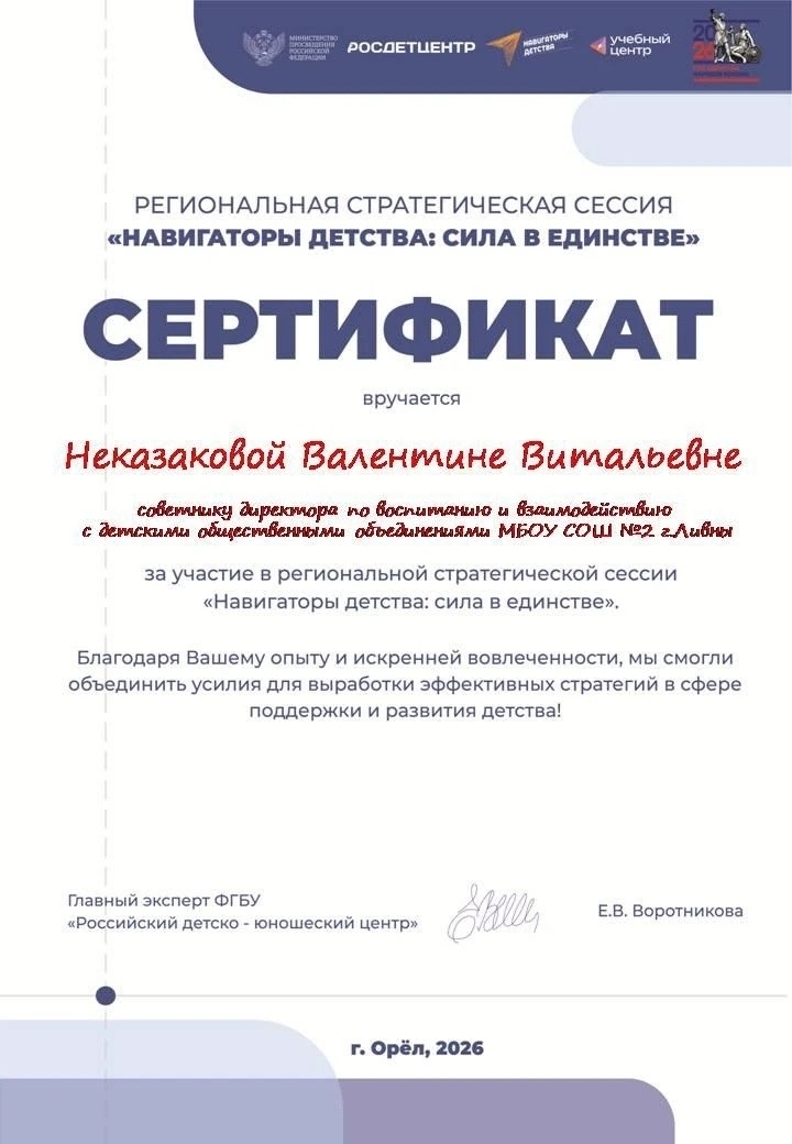 26 февраля советник директора по воспитанию и взаимодействию с детскими общественными объединениями МБОУ СОШ 2 г. Ливны, Валентина Витальевна Неказакова, приняла участие в Региональной стратегической сессии «Навигаторы детства: сила в единстве». Мероприятие, прошедшее в г. Орле, дало официальный старт Году единства народов России в сообществе навигаторов детства.